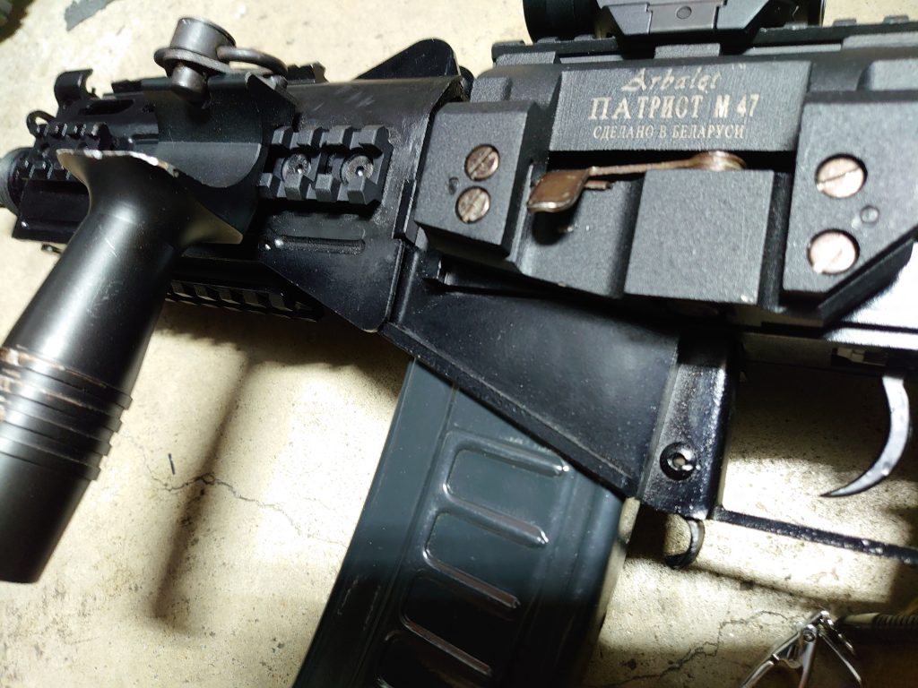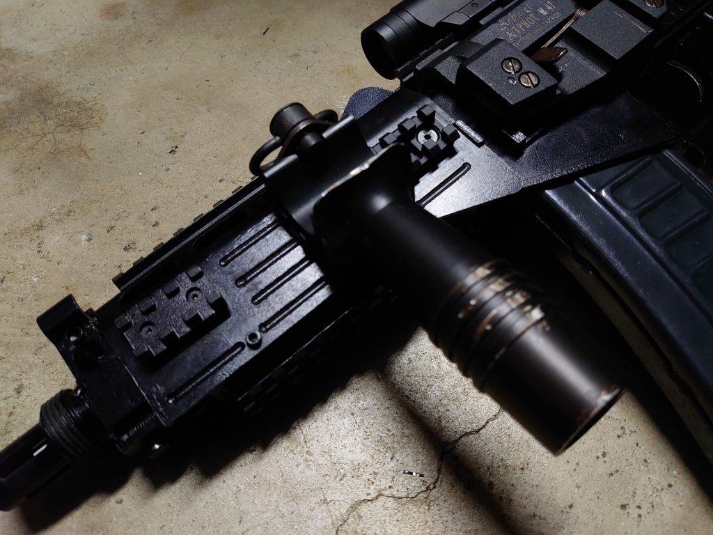 サイド後方にレイルを追加して 昔懐かしのオフセットフォアグリップ(アルミ製)付けてます。